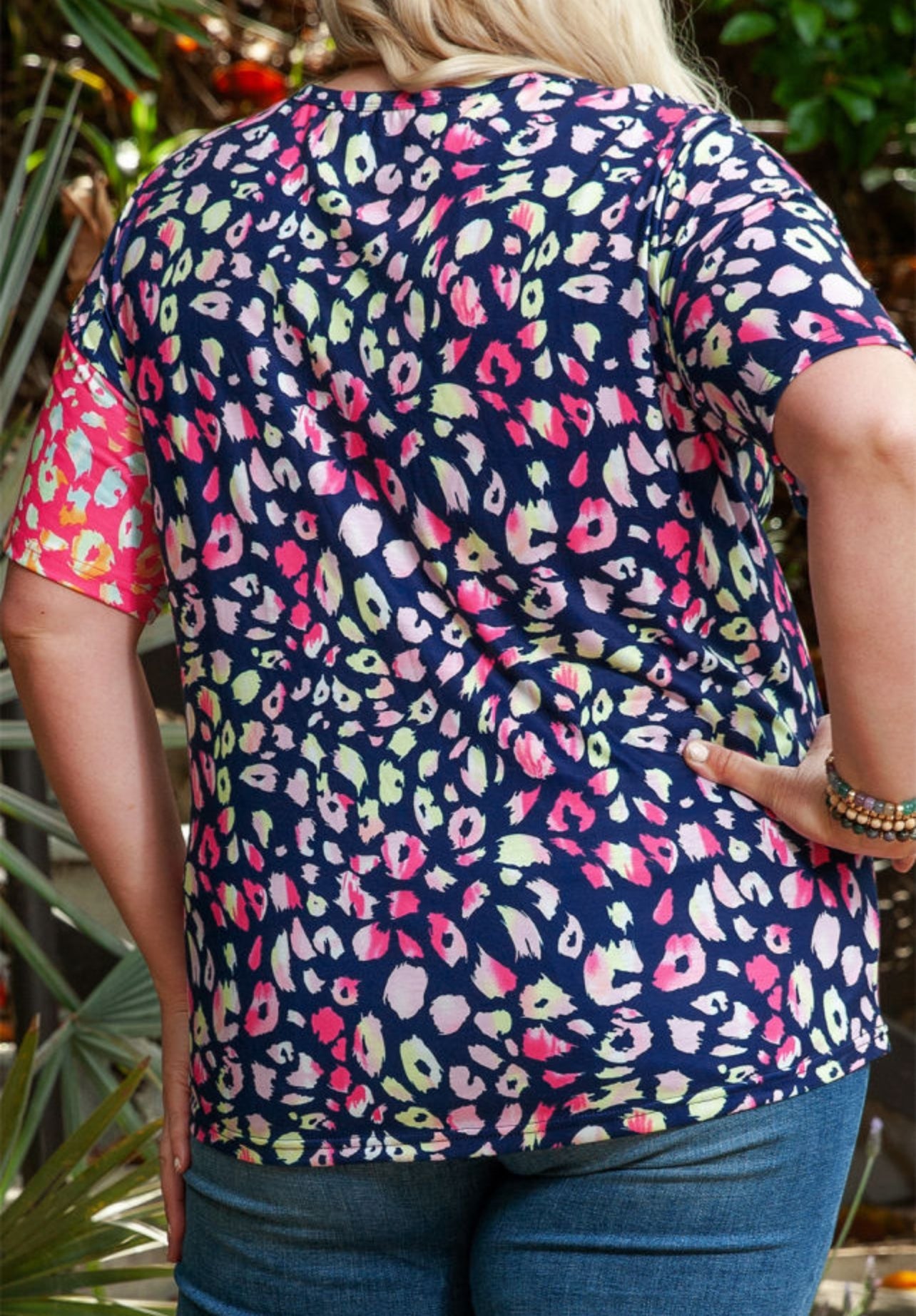 Camiseta de manga corta con un diseño vibrante de estampado animal print dividido en tonos azul marino y fucsia. Incluye un pequeño bolsillo frontal para un toque casual.