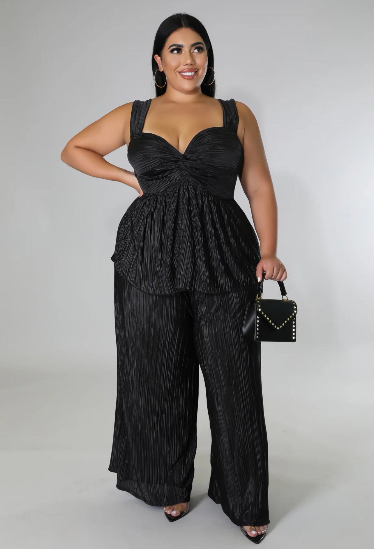 Set de dos piezas confeccionado en tela sin elasticidad para un look fluido y elegante. El top es de diseño sin mangas, con escote en V y detalle de nudo al frente que aporta un toque femenino y moderno. No cuenta con cierre, ofreciendo un ajuste cómodo y ligero. El pantalón es de tiro alto, sin stretch, con cintura elástica que brinda mayor comodidad y pantalón de pierna ancha que estiliza la silueta. La modelo usa talla 2X.