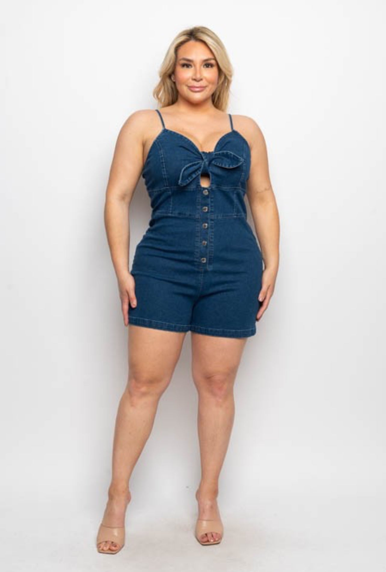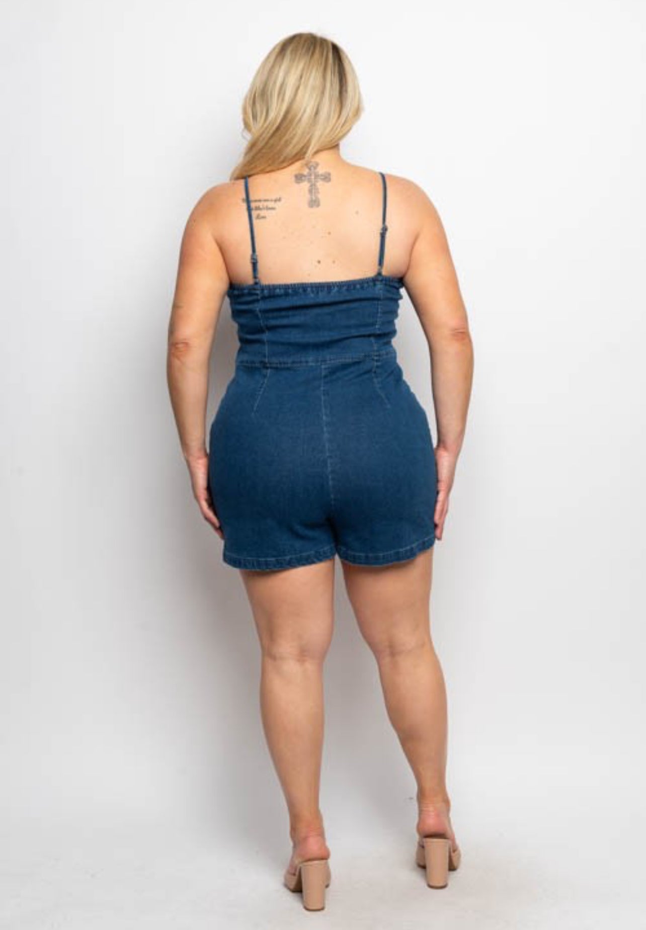 Romper en mahón 75% cotton, 23% poliéster y 2% spandex. No estira mucho.